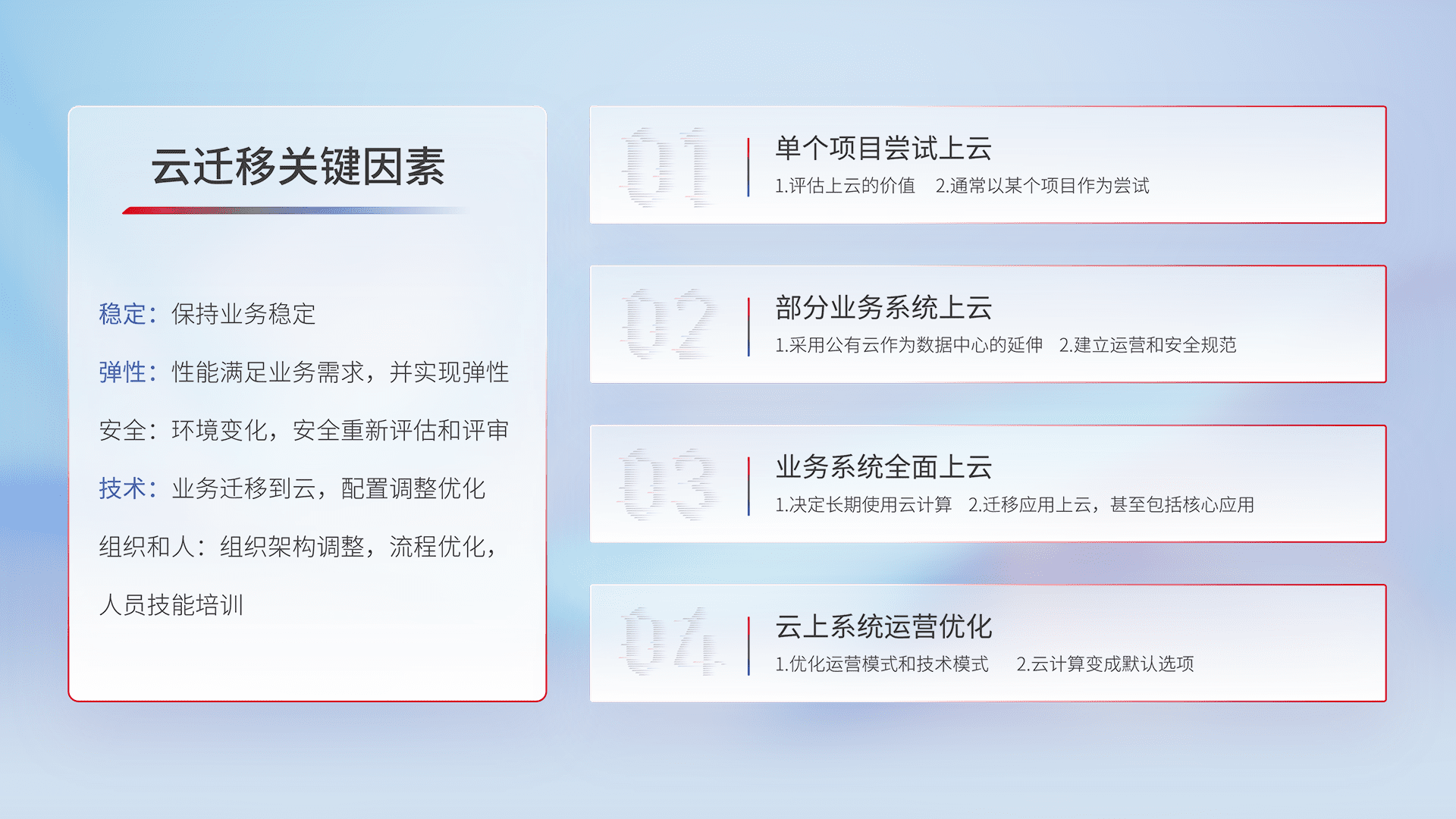 结合实际业务,,,从规划设计、、、云平台选型、、、、云原生改造、、、数据迁移、、集成交付,,,,迁移全过程为客户识别最佳上云路径,,,,做好风险识别管理,,,设计网络架构、、、身份权限、、安全审计合规、、、操作审计、、、日志审计、、监控告警策略、、、多站点容灾设计等,,对云上基础设施进行整体规划,,,提升IT治理水平,,,以满足弹性、、、、高可用、、高性能的需求。。